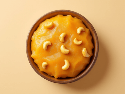 Cashew Halwa, known locally as 'Kaju Halwa', is a luxurious South Indian dessert celebrated for its creamy texture and rich flavor. Traditionally prepared during festive seasons like Diwali and weddings, this sweet treat showcases the natural sweetness and buttery taste of cashews or 'kaju'. The halwa is often served as prasad in temples and is a staple for special occasions in Tamil Nadu and Andhra Pradesh. Made with minimal ghee and the goodness of milk, Cashew Halwa is a healthier alternative to other sweets, making it perfect for calorie-conscious food lovers. The dish is renowned for its melt-in-the-mouth consistency and subtle notes of cardamom. Unlike the more popular 'Kaju Katli', Cashew Halwa is a warm, spoonable dessert, easy to prepare in a single pan. Its golden hue and aromatic flavor make it an irresistible addition to any Indian thali. Families often prepare this halwa to celebrate milestones, and its comforting taste brings people together, making it a must-have during celebrations. By using less sugar and ghee, this recipe offers a balanced indulgence suited for modern health needs. Cashew Halwa is not only delicious but also versatile, allowing for adjustments like substituting dairy with plant-based milk or reducing sugar for diabetic-friendly versions. This makes it a popular choice across households looking for authentic, healthy Indian desserts. The recipe below provides a step-by-step guide to making Cashew Halwa that fits your dietary preferences while delivering traditional flavor.