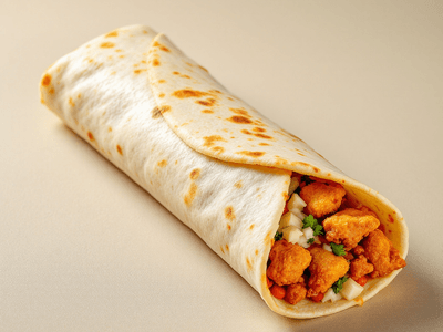 Chicken Kathi Roll is a balanced dish, offering lean protein from chicken, complex carbs from whole wheat atta, and dietary fiber from capsicum and onions. The use of dahi (curd) boosts probiotics and calcium. Mustard oil adds healthy fats and omega-3s. This roll provides B vitamins, vitamin C, and iron, making it a nutrient-rich meal suitable for a healthy Indian lunch.