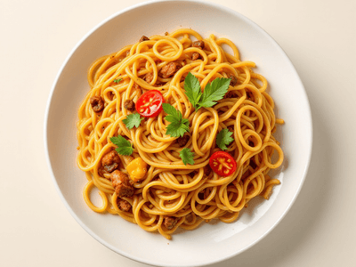 Indian-Style Mee Rebus is a delicious fusion noodle dish, reimagined with Indian flavors and vegetarian ingredients. Traditionally, Mee Rebus means 'boiled noodles', but this version infuses the essence of Indian spices, fresh vegetables, and a tangy, flavorful gravy. The dish is vibrant, aromatic, and perfect for those seeking a tasty and wholesome lunch option that aligns with Indian culinary traditions. This vegetarian Indian noodle bowl is a celebration of fusion cuisine, using whole wheat noodles, sprouted moong, and a medley of classic Indian masalas such as jeera (cumin), dhania (coriander), and garam masala. The gravy is thickened naturally with boiled potatoes (aloo) and besan (gram flour), making it both nutritious and satisfying. Often enjoyed during festive gatherings or special family lunches, Indian-Style Mee Rebus brings together the comfort of noodles with the warmth of Indian spices, making it a great choice for Holi or Diwali feasts, or even as a hearty weekday meal. The taste is a delightful balance of savory, sweet, and tangy notes, thanks to the use of tamarind (imli) pulp, jaggery (gur), and fresh lime juice. This dish is a fantastic way to introduce kids and adults alike to healthy Indian fusion cuisine, combining the appeal of noodles with the wholesome goodness of Indian vegetables and lentils.