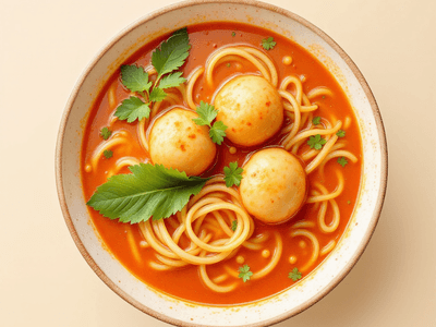 Laksa with Fish Balls is a vibrant, flavorful noodle soup that has found a unique home in the kitchens of Indian coastal regions, especially among communities with Malaysian influence like the Chettinad Tamils and Malayalees. Traditionally, Laksa is known for its aromatic coconut milk broth, fragrant spices, and the addition of delicious 'fish balls'. In this vegetarian Indian adaptation, we use soya-based or paneer-based 'fish balls', making the dish perfect for those who wish to enjoy rich flavors without compromising on vegetarian values. This healthy Laksa is a delight during monsoon lunches or festive occasions such as Onam or Vishu, thanks to its comforting warmth and nourishing ingredients. The blend of fresh coconut milk (nariyal doodh), homemade curry paste, and fresh herbs creates a harmonious balance of creamy, spicy, and tangy flavors. Laksa with Fish Balls is both a celebration of India's love for fusion cuisine and a testament to our ability to adapt global flavors to suit local palates, making it a must-try for food lovers looking for a nutritious yet indulgent lunch.