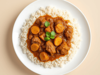 Mutton Curry with Rice, known locally as 'Mamsam Pulusu Sadam' in Andhra or 'Kari Kuzhambu Saadam' in Tamil Nadu, is a beloved South Indian lunch staple. This aromatic curry combines tender mutton pieces simmered in a medley of freshly ground spices, coconut, and tangy tomatoes, served with steaming hot rice. The dish is cherished for its rich, spicy, and comforting flavors that perfectly complement the mildness of plain rice, making it a satisfying meal for both festive occasions and everyday family lunches. Rooted in the culinary traditions of Andhra Pradesh, Tamil Nadu, and Kerala, Mutton Curry with Rice is often prepared during family gatherings and festivals like Pongal, Vishu, and Onam. Each region adds its own touch, whether it’s coconut milk in Kerala or fiery red chilies in Andhra. Choosing lean cuts of mutton and minimal oil makes this classic dish lighter, without compromising on authenticity or taste. The slow-cooked curry brings out deep, layered flavors that are both hearty and nourishing, making it an excellent choice for those seeking wholesome Indian recipes.