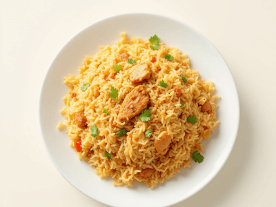 Nasi Goreng with Chicken provides a balanced meal rich in protein from the chicken and egg, complex carbohydrates from basmati rice, and essential vitamins from vegetables like carrot and capsicum. The use of ghee or olive oil adds healthy fats, while coriander offers antioxidants. The dish is high in dietary fiber, B vitamins, potassium, and contains moderate calories, supporting both weight management and muscle maintenance.