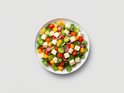 Paneer Salad is a vibrant and wholesome Indian vegetarian dish, perfect for lunch or as a light meal during the hot summer months. Paneer, also known as Indian cottage cheese, is a staple in North Indian cuisine and is celebrated for its mild flavor and rich protein content. Combined with a medley of crisp, fresh vegetables like cucumber (kheera), tomatoes, carrots (gajar), and bell peppers (shimla mirch), this salad offers a delightful balance of textures and flavors, enhanced by traditional spices and a tangy lemon dressing. This dish is widely enjoyed across India, particularly in urban households and health-conscious communities. Paneer Salad is often served during festivals like Holi and Diwali as a refreshing side, and its versatility makes it a popular choice for lunchboxes and quick meals. With roots in North Indian cuisine, it has gained popularity throughout the country for its nutritious profile and ease of preparation. The use of locally sourced vegetables and paneer makes it both accessible and authentic, while the addition of coriander (dhaniya) and mint (pudina) lends a distinctly Indian aroma and taste. Paneer Salad is not only delicious but also aligns perfectly with modern dietary trends in India. Its high protein, low carbohydrate profile is ideal for those tracking their calories and aiming for a balanced diet. Whether enjoyed on its own or alongside whole wheat roti (atta roti), Paneer Salad remains a beloved vegetarian option that brings together tradition, health, and flavor in every bite.