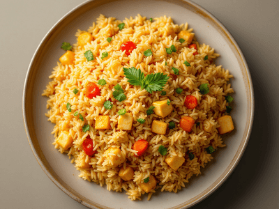Paneer Schezwan Fried Rice is a vibrant Indo-Chinese dish, popular across India for its unique blend of spicy Schezwan sauce and soft, protein-rich paneer. Originating from the bustling street food culture of Mumbai and Kolkata, this recipe has become a staple in Indian homes, especially during family gatherings and festive occasions like Diwali and Holi. Its fiery taste and colorful presentation make it a crowd favorite for lunch, offering a satisfying meal that appeals to both adults and children. The dish marries the classic Indian ingredient paneer (fresh cottage cheese) with aromatic basmati rice, crisp vegetables, and Schezwan sauce, which is made using red chillies and garlic. Paneer Schezwan Fried Rice is often served in tiffin boxes and as a lunch option because it is filling, easy to digest, and packs a punch of flavors. With a focus on health-conscious cooking, this recipe uses minimal oil and loads of vegetables, making it perfect for calorie-conscious eaters and vegetarians. Its regional variations—like adding capsicum (shimla mirch), carrots (gajar), or spring onions (hara pyaaz)—reflect the diversity of Indian palates. Whether enjoyed during festivals or as a weekend treat, Paneer Schezwan Fried Rice brings together Indian flavors and Indo-Chinese techniques, making it a delicious, wholesome choice for anyone seeking a healthy and flavorful meal.