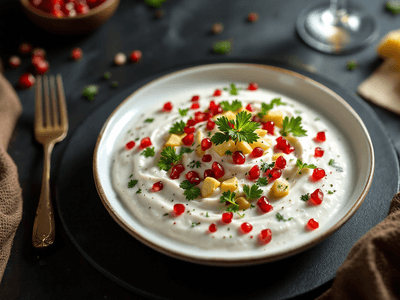Pomegranate Raita, known as 'Anar ka Raita' in Hindi, is a refreshing North Indian yogurt side dish that beautifully combines the sweet-tart burst of pomegranate arils with the creamy tang of dahi (curd). Traditionally served as an accompaniment to Indian thalis, pulao, or biryani, Pomegranate Raita is not only visually appealing with its ruby-red gems but also delivers a delightful balance of flavors and textures. This raita is especially popular during the hot Indian summers, when cooling dishes are in high demand. Its light and digestible nature makes it a favorite during Indian festivals like Holi and Diwali, when heavier, spicy foods are often served. Pomegranate Raita is a versatile dish that can be prepared quickly, making it ideal for lunch or a light meal. The unique combination of fresh anar, roasted jeera (cumin), and a hint of green chili creates a harmonious blend that is both nourishing and satisfying, capturing the essence of Indian home cooking.