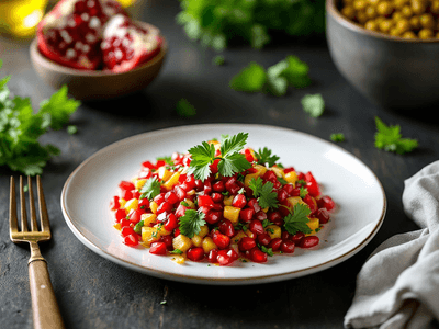 Pomegranate Salad, known as Anar ka Salad in Hindi, is a vibrant, refreshing addition to any Indian meal. This salad beautifully combines the sweet-tart burst of pomegranate pearls with the crispness of fresh seasonal vegetables and a hint of Indian spices. Rooted in the traditions of North India, especially Punjab and Delhi, Anar ka Salad is a popular choice during the winter months when pomegranates are at their juiciest. The dish is celebrated for its simplicity, quick preparation, and the way it brings together flavors, colors, and textures on one plate. This Pomegranate Salad is not only delicious but also a feast for the eyes, making it a frequent feature at festive tables during Diwali, Holi, and family gatherings. Its combination of fresh ingredients makes it perfect for a light lunch or as a side dish during elaborate Indian thalis. The medley of cucumber, tomato, onion, and coriander with the jewel-like pomegranate arils creates a delightful taste that appeals to all age groups. With minimal oil and a dash of chaat masala, this salad is both health-conscious and flavor-packed—an ideal choice for calorie trackers and those who appreciate authentic Indian cuisine.