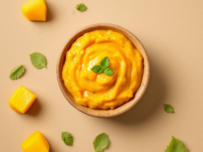Raw Mango Chutney is rich in vitamin C, antioxidants, and dietary fiber from mangoes, coriander, and mint. It contains minimal fat and is low in calories, making it ideal for weight management. The addition of cumin aids digestion, while jaggery provides trace minerals like iron. This chutney is gluten-free, vegan, and suitable for most dietary preferences. The herbs offer anti-inflammatory benefits, and green chilies boost metabolism.