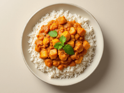 Sri Lankan Rice and Curry is a vibrant vegetarian lunch dish, deeply rooted in the culinary traditions of South India and Sri Lanka. Its essence lies in the harmonious combination of steamed rice ('chawal') paired with an array of vegetable curries, typically featuring local produce like pumpkin, brinjal (baingan), and drumstick (saijan ki phalli). The dish is renowned for its balanced flavors—ranging from mild to spicy—and its ability to showcase regional spices like mustard seeds (rai), curry leaves (kari patta), and coconut milk, which lend a creamy texture and unique aroma. In India, especially in Tamil Nadu and Kerala, variations of rice and curry are enjoyed during festivals like Pongal and Onam, signifying prosperity and the bounty of the harvest. The vegetarian version is not only celebrated for its taste but also for its wholesome nutrition, making it a favorite for health-conscious families. Its adaptability for lunch and festive occasions, combined with its mild yet flavorful profile, makes Sri Lankan Rice and Curry a delightful addition to any Indian meal plan. This dish is perfect for those seeking a nutritious, hearty meal with a touch of South Indian tradition.