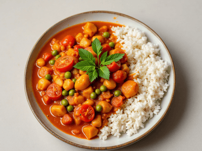 Tomato and Peas Curry, known as Tamatar Matar ki Sabzi in North India, is a comforting and vibrant vegetarian dish celebrated for its simplicity and fresh flavors. This curry is a staple in many Indian households, especially during the winter months when green peas (matar) are in season. The combination of tangy tomatoes and sweet peas, cooked with warming spices, makes it a satisfying choice for lunch. It pairs beautifully with phulka, roti, or a bowl of steamed rice, making it a versatile dish for daily meals. Rooted in the culinary traditions of Uttar Pradesh and Punjab, Tamatar Matar ki Sabzi is often prepared during festivals like Holi and Diwali for its quick preparation and universal appeal. The dish is light yet filling, with minimal oil and no cream or butter, making it ideal for health-conscious individuals. Its natural sweetness and tanginess appeal to both adults and children, and it can be easily adapted to suit different dietary needs. Tomato and Peas Curry is perfect for those seeking a balanced, wholesome meal packed with plant-based protein, fiber, and vitamins. Its vibrant color and aromatic spices bring a sense of celebration to everyday dining, reflecting the warmth and hospitality of Indian family kitchens.