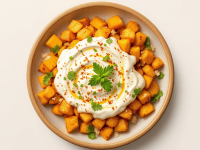 This version of Dahi Aloo Chaat is a healthy Indian snack as it utilizes boiled potatoes instead of fried, reducing calorie content. Low-fat dahi adds creaminess without excess fat, and fresh herbs and spices boost flavor and nutrition. The recipe avoids processed ingredients, focusing on fresh, whole foods that support digestion and provide lasting energy through complex carbs and probiotics.
