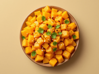 Papaya Chaat is a refreshing and tangy Indian snack celebrated across North India, especially during the hot summer months. This vibrant dish combines ripe papaya with a medley of traditional Indian spices, fresh herbs like dhania (coriander), and zesty chutneys to create a burst of flavors in every bite. It is commonly enjoyed as a street food delicacy, beloved for its quick preparation, unique taste, and nutritional value. Originating from the bustling lanes of Delhi and Lucknow, Papaya Chaat has become a staple during Indian festivals like Holi and Diwali, when light, fruit-based snacks are appreciated between heavier festive treats. The balance of sweet, spicy, and tangy flavors, paired with crunchy sev and the freshness of anardana (pomegranate seeds), makes it a crowd-pleaser for all age groups. This chaat is also an excellent way to incorporate seasonal fruits into your diet, promoting healthy eating habits during celebrations and family gatherings. As a health-conscious option, Papaya Chaat uses minimal oil and leverages the natural sweetness of papaya, making it a perfect choice for calorie tracking and balanced nutrition. The addition of kala namak, roasted jeera powder, and chaat masala enhances the taste without adding unnecessary calories, making this snack not only delicious but also guilt-free.